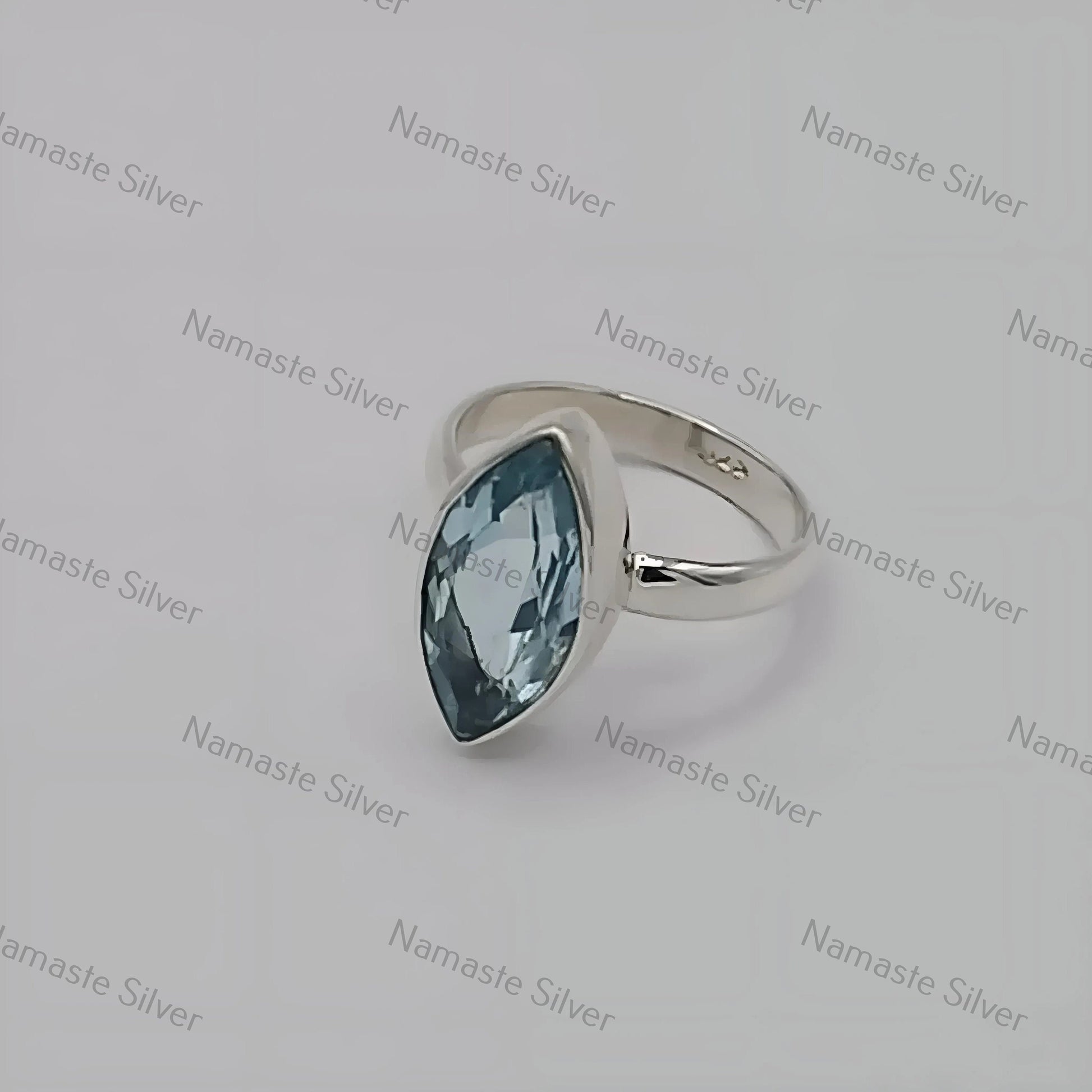 Blue Topaz Ring, 925 Sterling Silver Statement Promise Ring, Natural Blue Topaz Marquise Gemstone Handmade Boho Jewelry, Unique Gift for Her