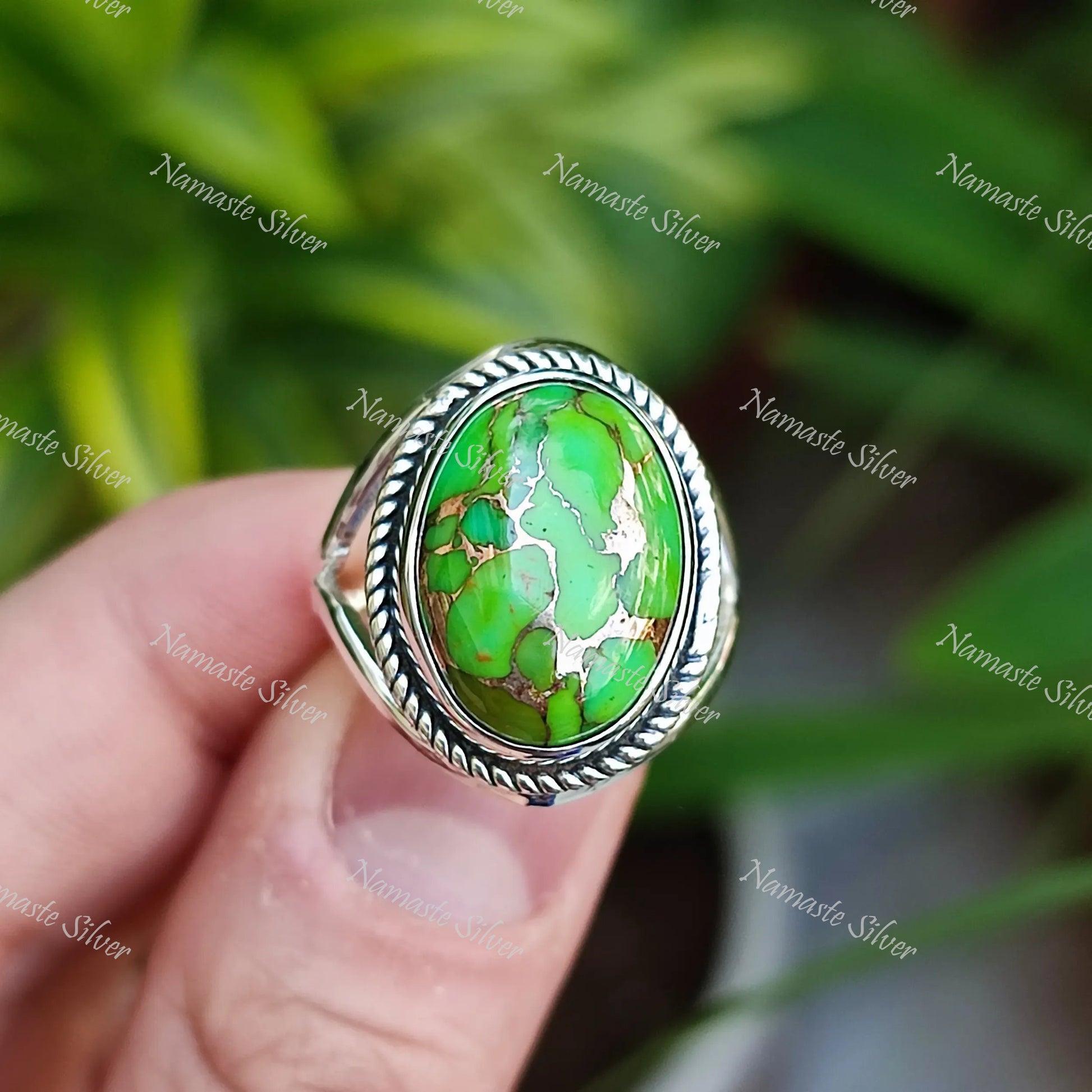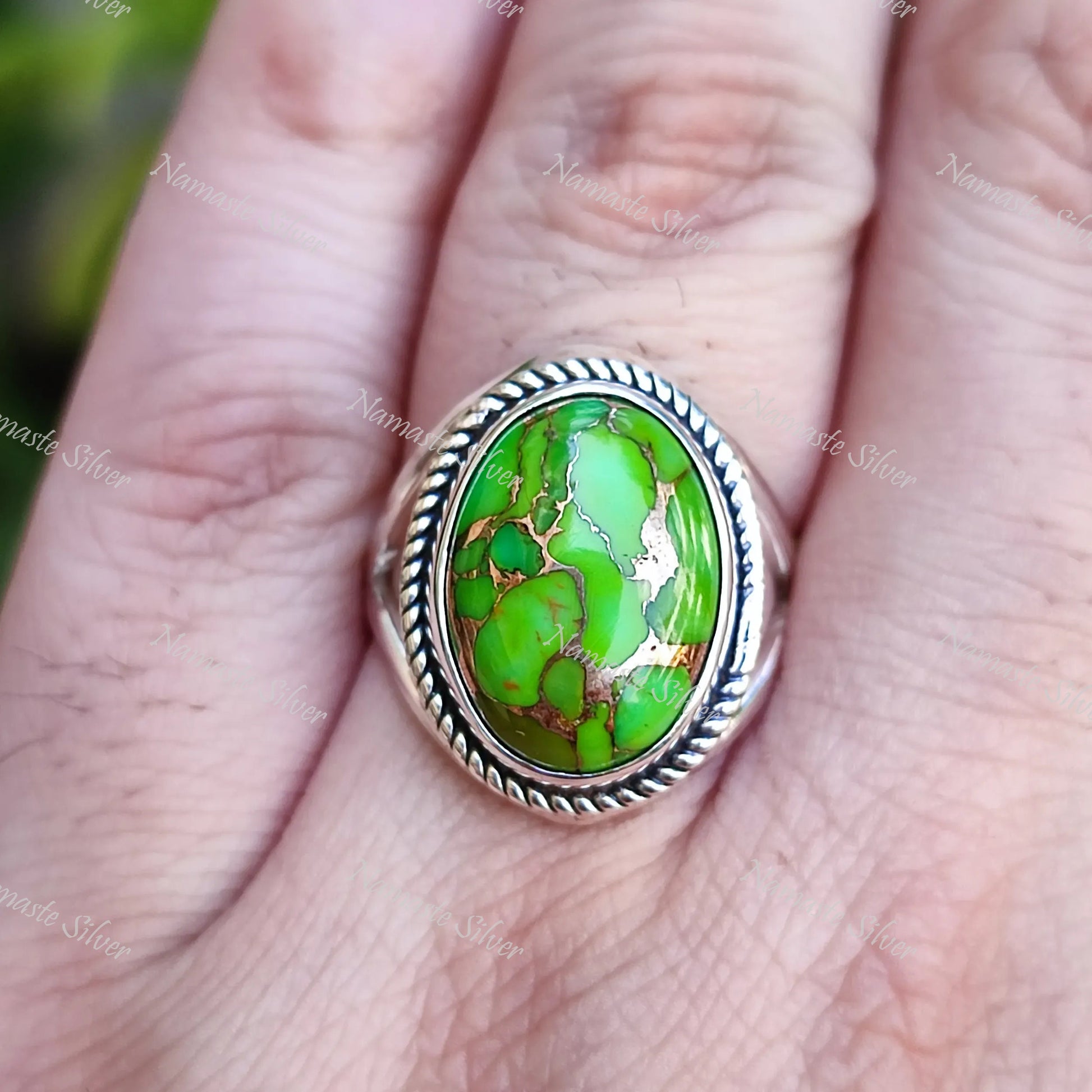 Green Turquoise Ring, 925 Sterling Silver Statement Promise Ring, Green Copper Turquoise Oval Gemstone Handmade Boho Jewelry, Gift for her