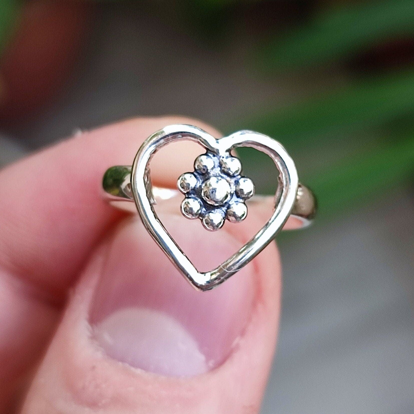 Heart Ring, 925 Sterling Silver Handmade Dainty Floral Ring for Women, Heart Shape Flower Love Minimalist Boho Jewelry, Unique Gift for Her