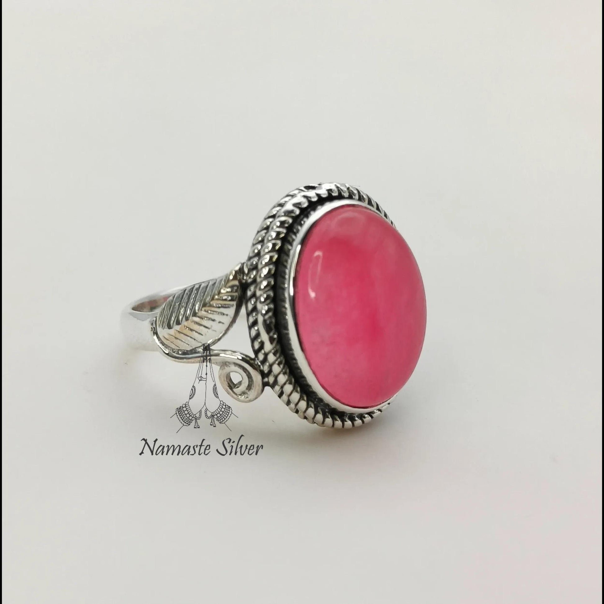 Pink Jade Ring, 925 Sterling Silver Promise Ring, Pink Jade Oval Gemstone Handmade Jewelry, Elegant Proposal Leaf Ring, Unique Gift for her