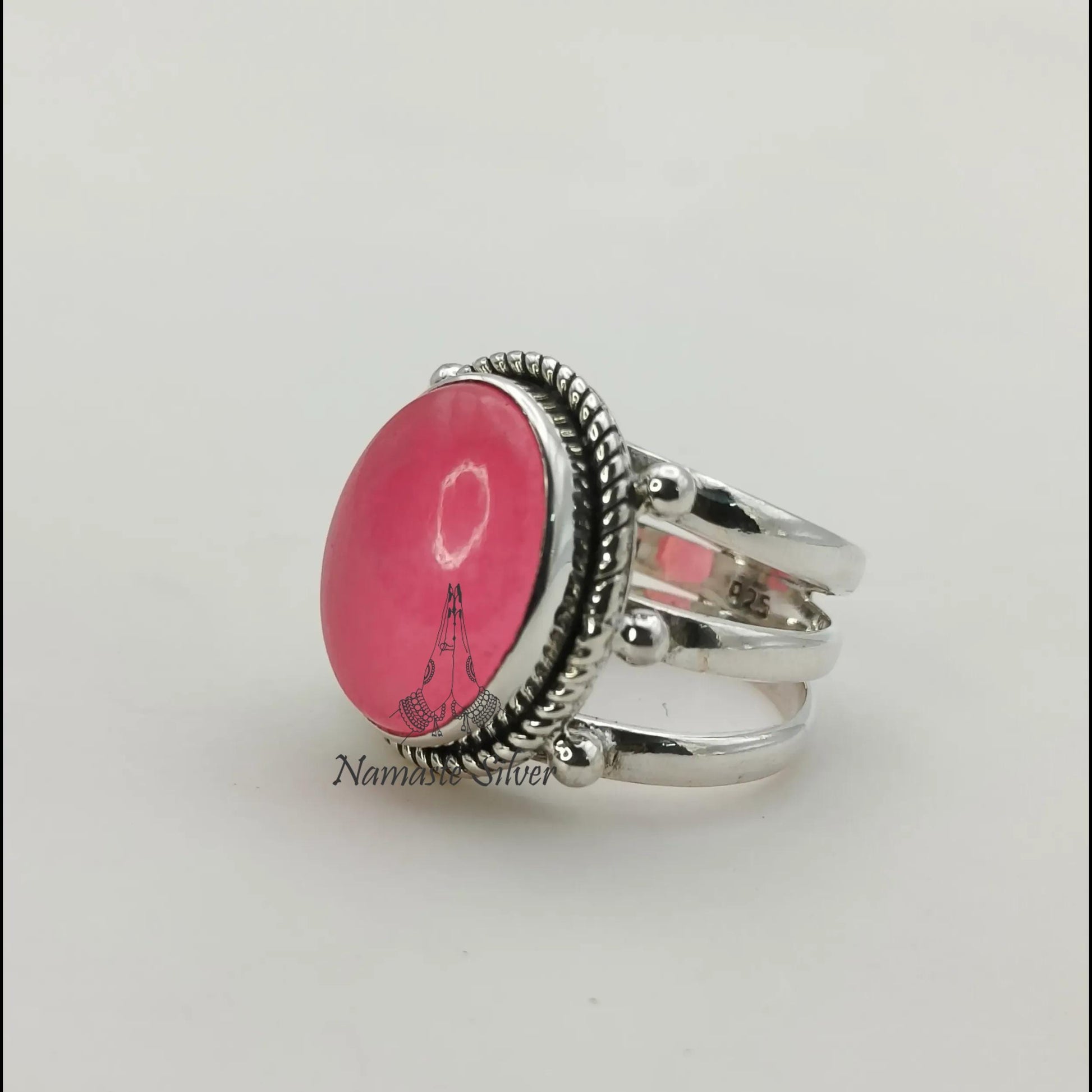 Each ring is carefully crafted using premium 925 sterling silver, paired with an oval-cut pink jade gemstone. The triple band design adds a contemporary twist, symbolizing strength, unity, and everlasting love.