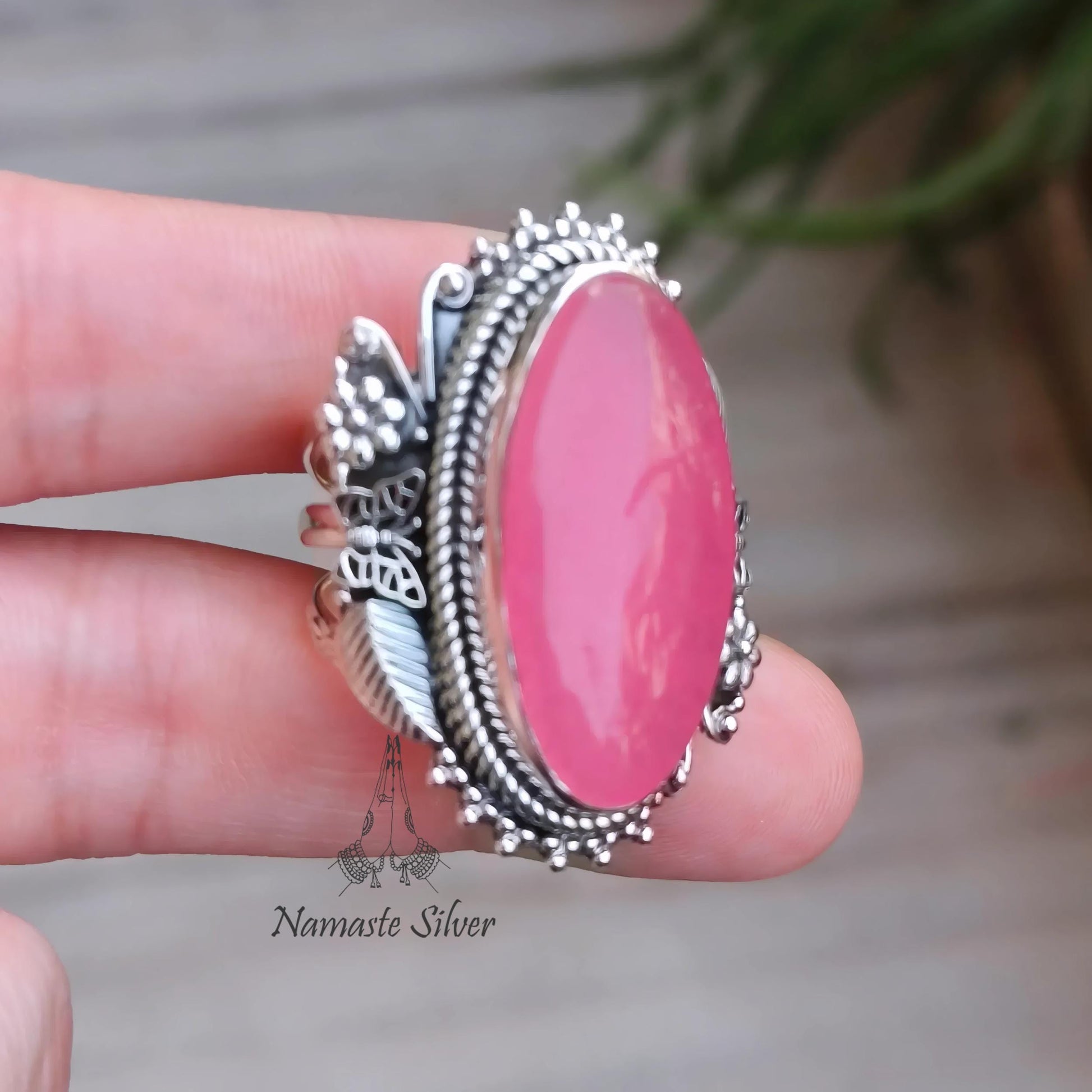 Step into the enchanting world of boho elegance with our handcrafted Pink Jade Sterling Silver Statement Ring. Inspired by nature's delicate beauty, the intricate floral and leaf patterns embrace the vibrant pink jade gemstone, creating a harmonious blend of art and style.