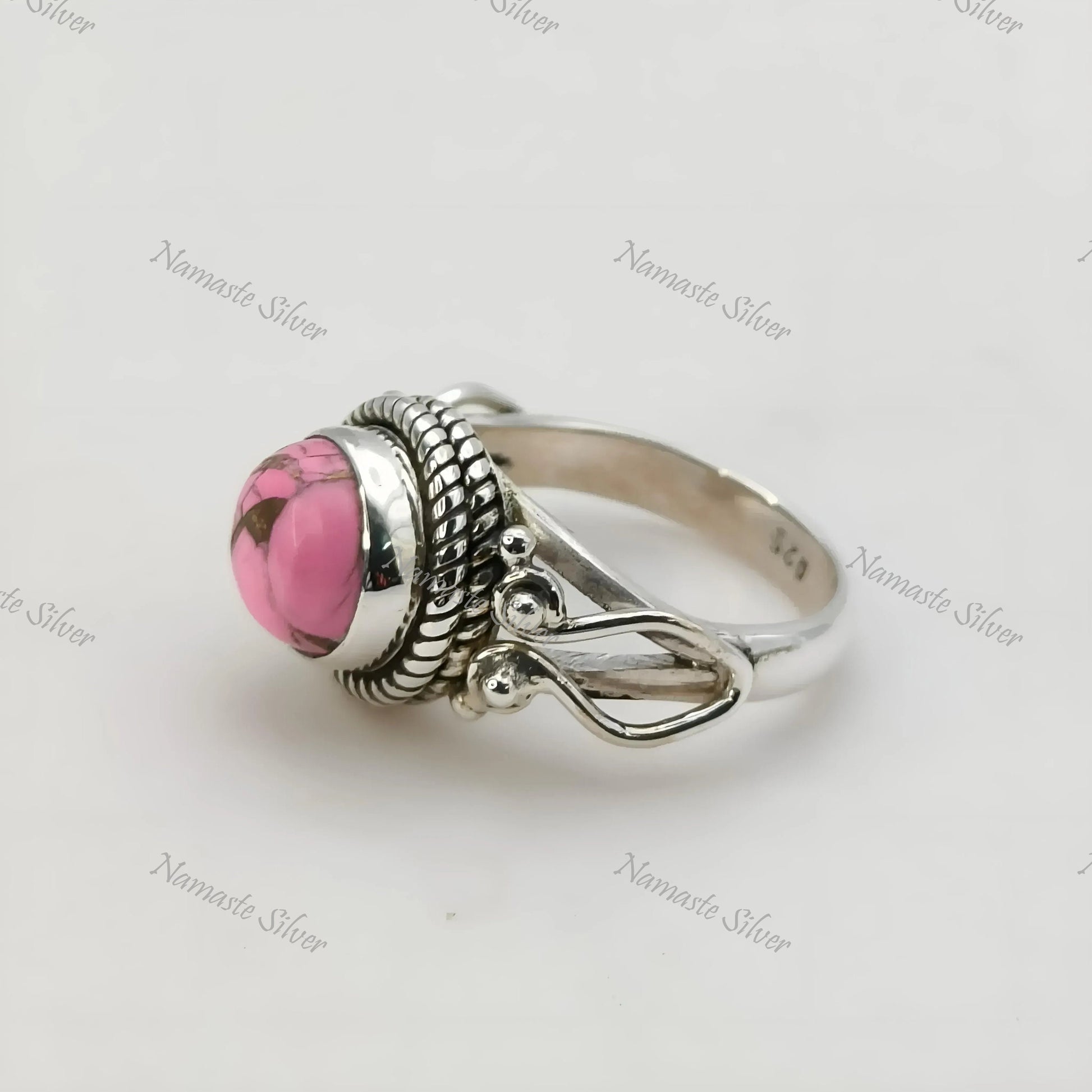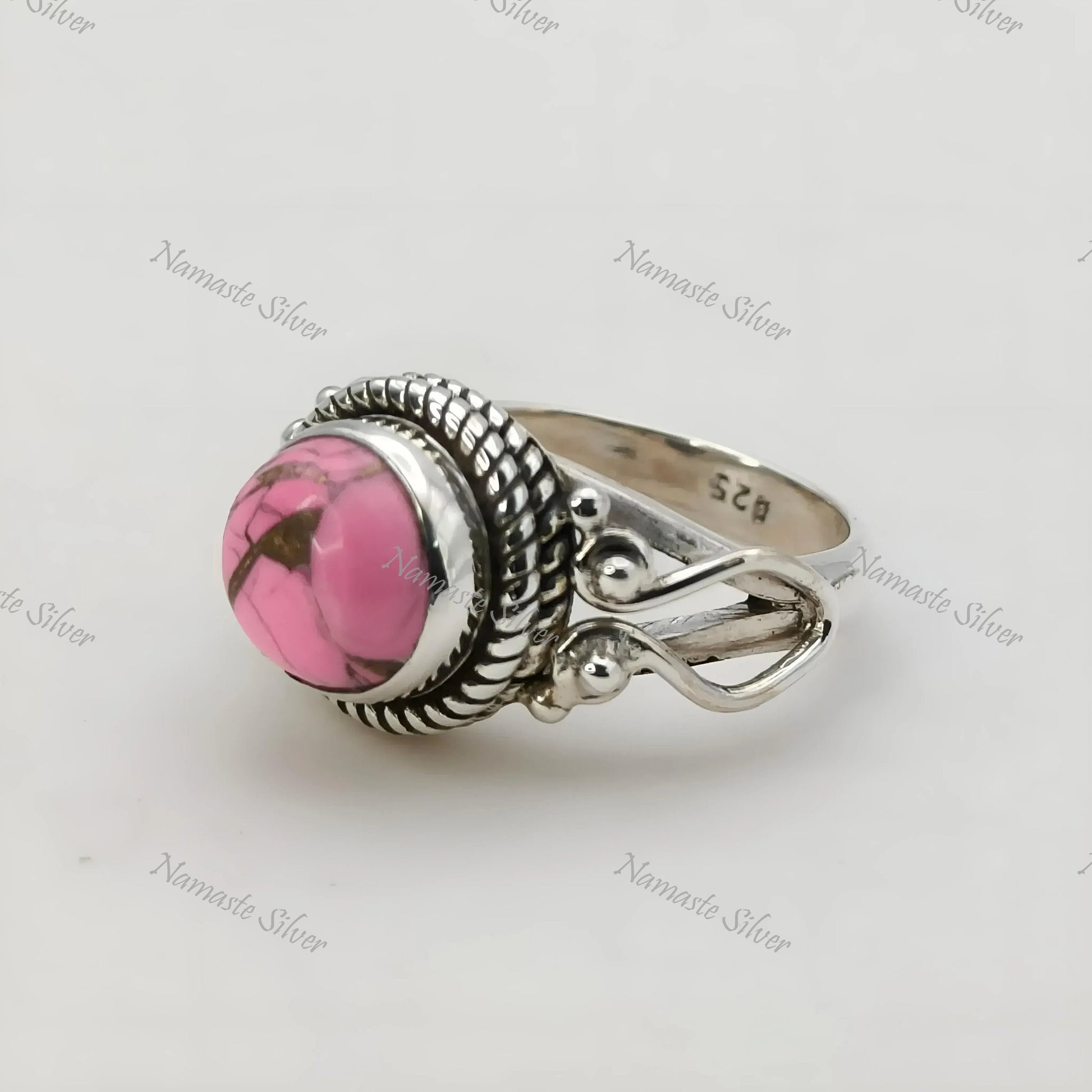 Pink Turquoise Ring, 925 Sterling Silver Promise Ring, Natural Pink Copper Turquoise Round Gemstone Handmade Jewelry, Unique Gift for Her