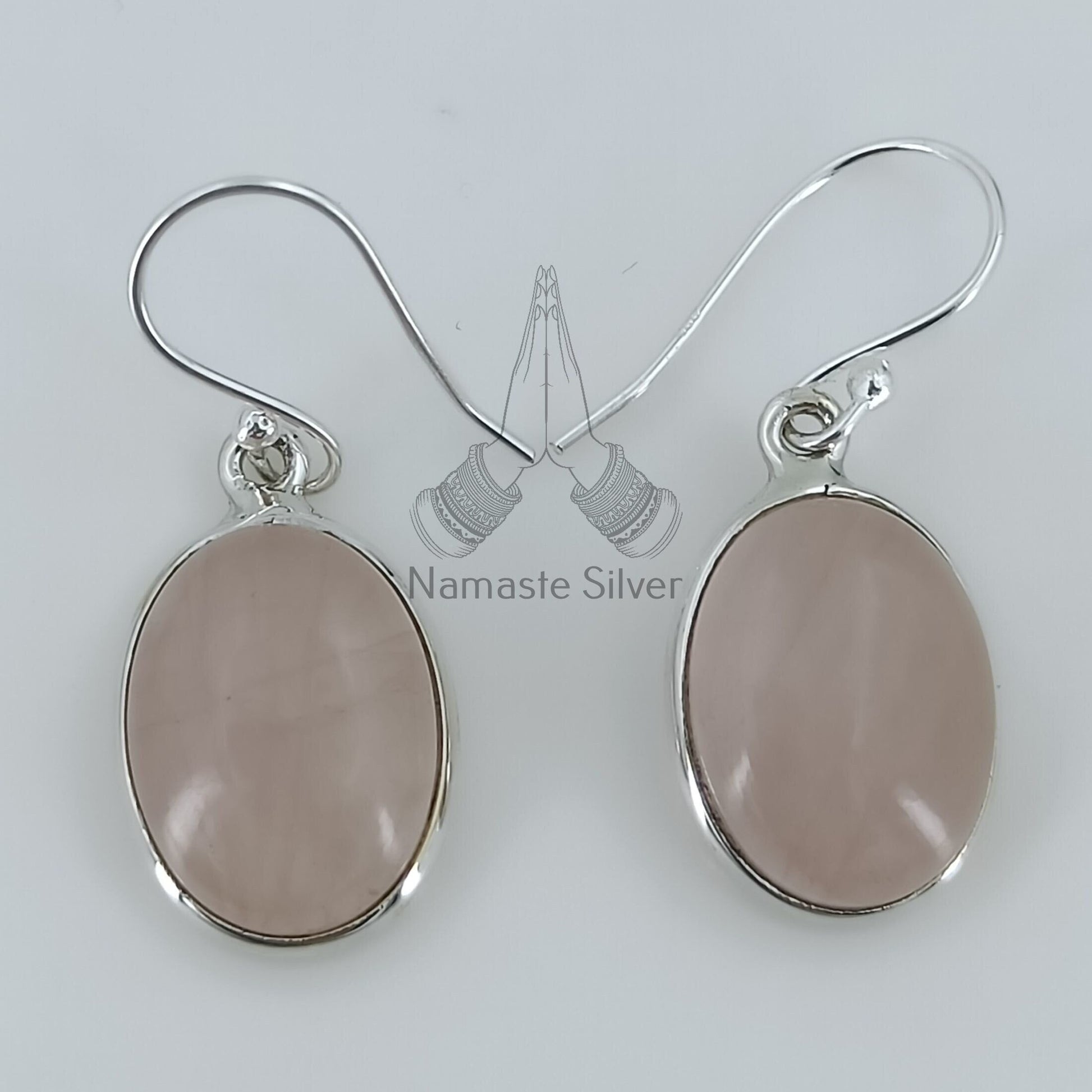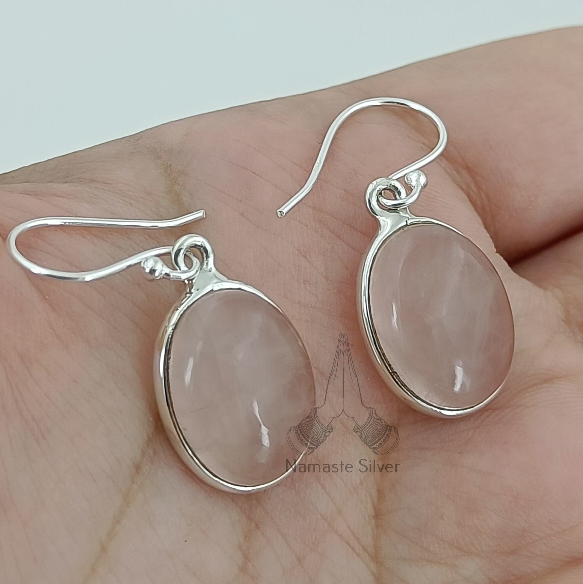 Natural Rose Quartz Oval 925 Solid Sterling Silver Handmade Statement Dangle Earrings for Girls / Women.